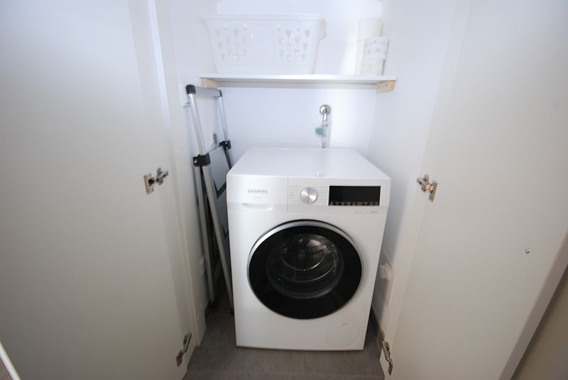Das geräumige innenliegende Badezimmer verfügt über ein Waschbecken und eine Duschkabine. Das WC ist separat. Im Flur ist eine Abstellkammer vorhanden, in der eine Waschmaschine zur Verfügung steht.