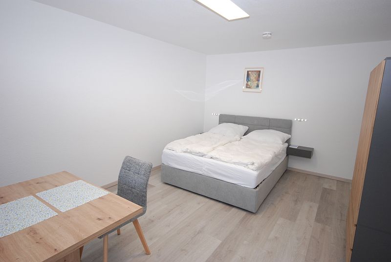 Die Wohnung ist mit einem allergikerfreundlichen Parkettboden ausgelegt. Im Wohnschlafraum befindet sich ein Box-Spring-Doppelbett. Der Wohn-Schlafraum ist vom Raumangebot großzügig bemessen. Der Wohn-Schlafraum ist zusätzlich möbliert mit einem Esstsich mit zwei Stühlen sowie mit einem Sideboard mit Farb-TV und einem Kleiderschrank. WLAN ist vorhanden.