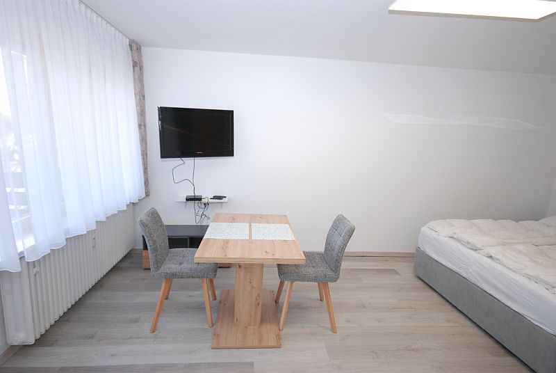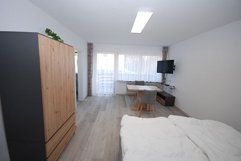Die Wohnung ist mit einem allergikerfreundlichen Parkettboden ausgelegt. Im Wohnschlafraum befindet sich ein Box-Spring-Doppelbett. Der Wohn-Schlafraum ist vom Raumangebot großzügig bemessen. Der Wohn-Schlafraum ist zusätzlich möbliert mit einem Esstsich mit zwei Stühlen sowie mit einem Sideboard mit Farb-TV und einem Kleiderschrank. WLAN ist vorhanden.